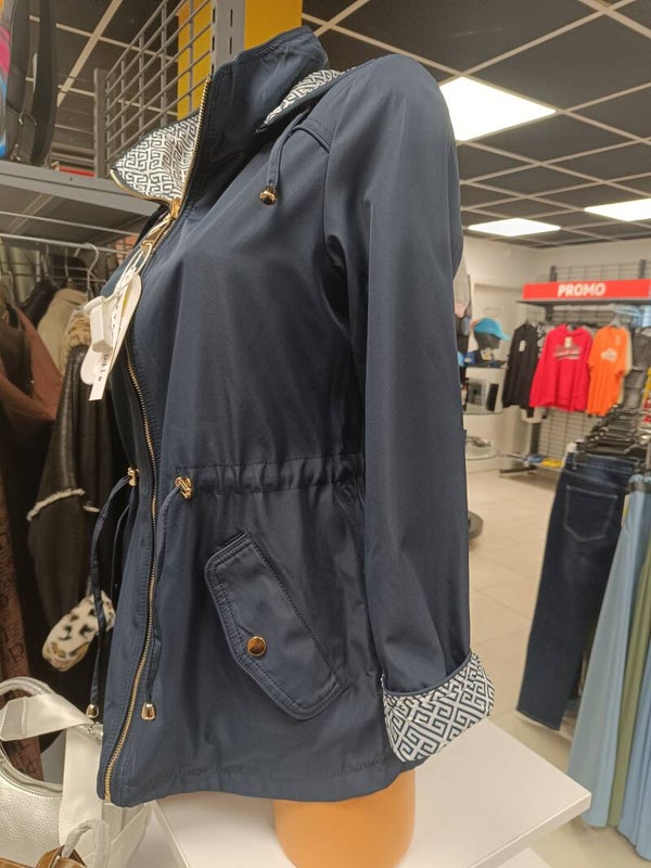 Veste réversible un côté uni et l'autre à motifs noir et blanc.
